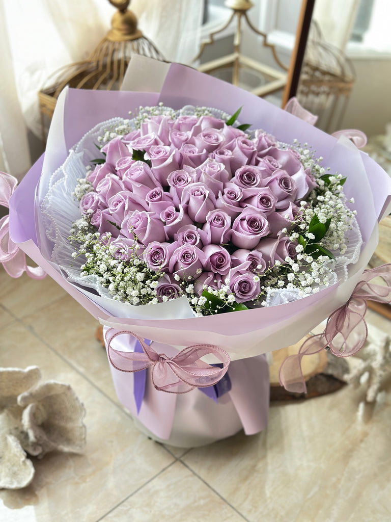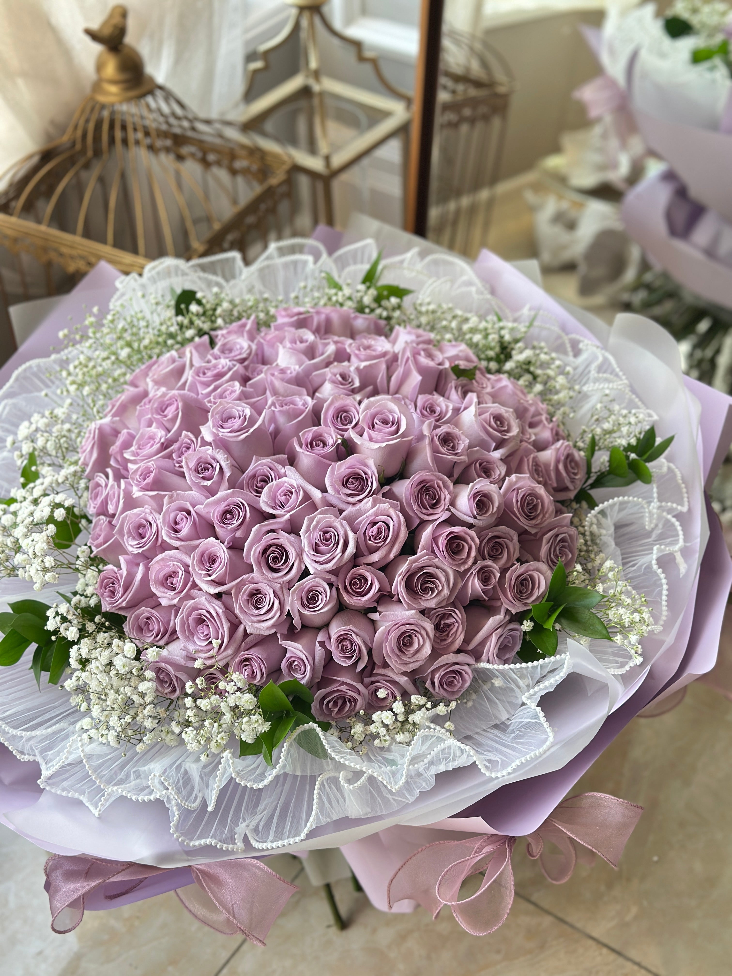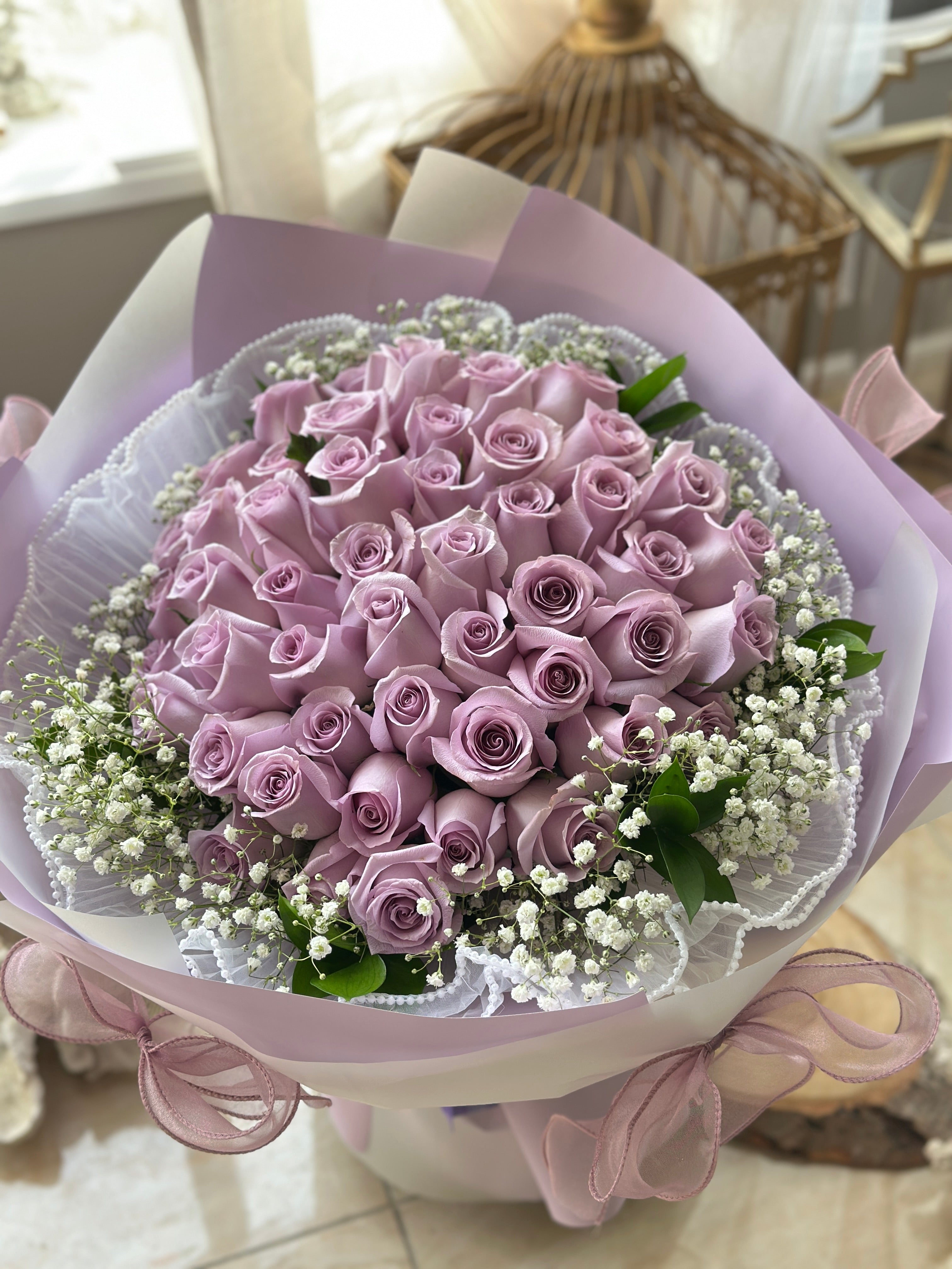 This romantic, hand-wrapped bouquet features dreamy lavender roses paired with soft, cloud-like baby’s breath, creating a tender harmony of color and texture. Wrapped in luxurious layers and finished with an elegant chiffon ribbon, it feels like a gentle love story brought to life — graceful, heartfelt, and timeless. A perfect gift to express deep affection, admiration, and the sweetest emotions.