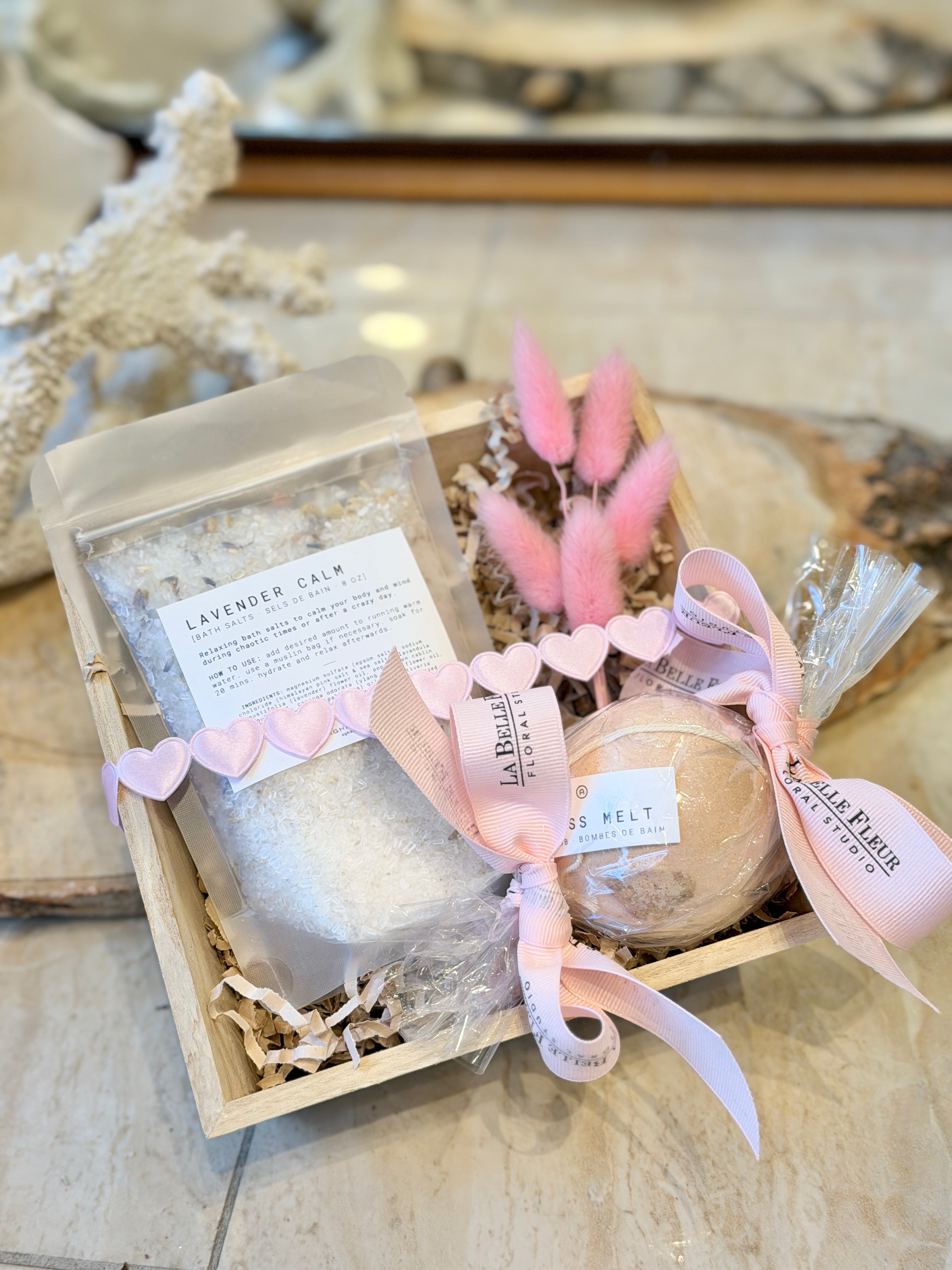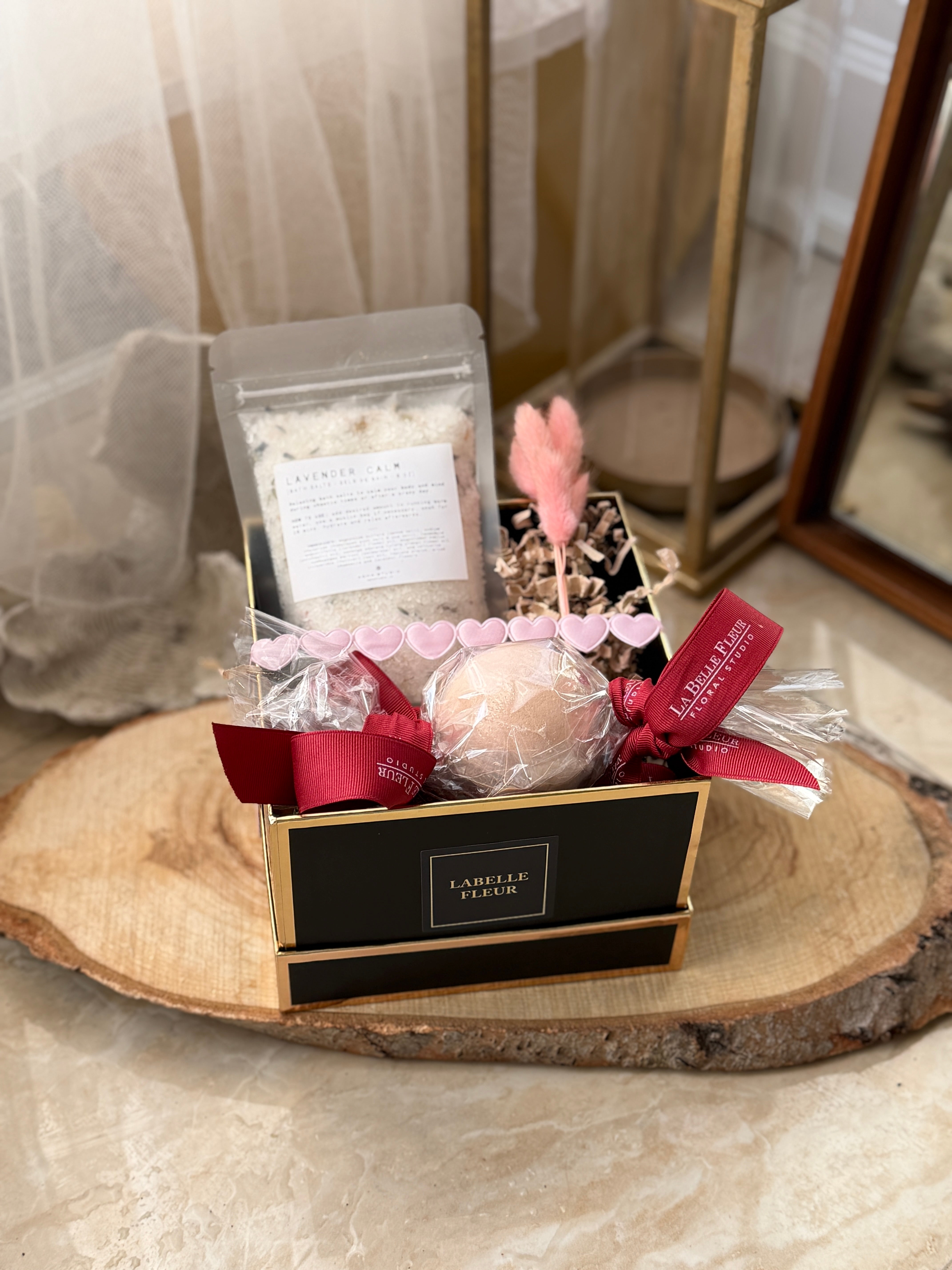 Infused with relaxing essential oils like lavender, patchouli, ylang ylang, palmarosa, and vetiver, plus nourishing minerals from premium epsom salt, Himalayan pink salt, and sea salt. These salts are all-natural, vegan, and cruelty-free, ensuring a calming bath that soothes the body and mind.