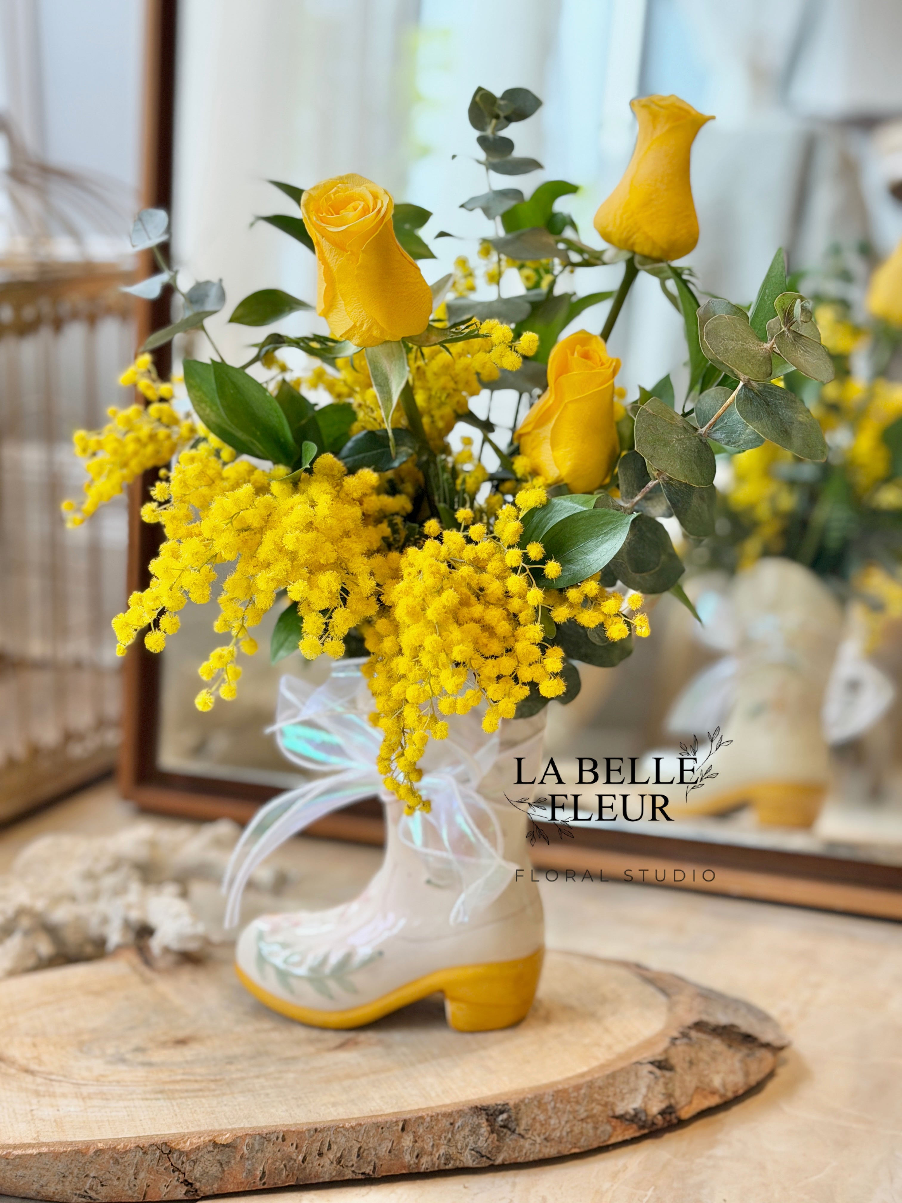 A cheerful and uplifting arrangement featuring radiant yellow roses, fluffy mimosa blooms, and fresh eucalyptus. Designed in a charming ceramic boot vase and finished with a soft ribbon, this piece brings warmth, happiness, and a touch of whimsy to any space. Perfect for celebrating special moments, sending a thoughtful surprise, or simply brightening someone’s day with sunshine-inspired florals. 💛🌼